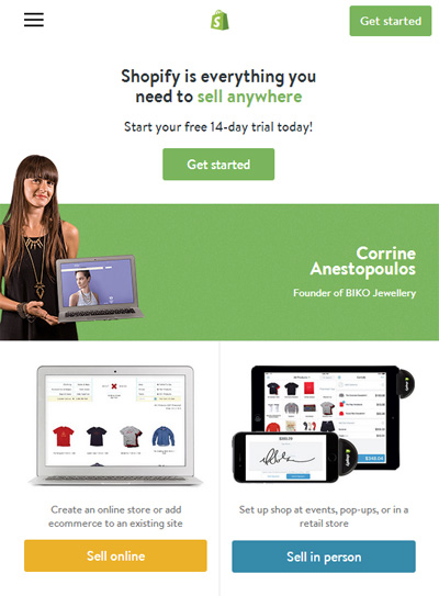 我們發現,Shopify 并沒有像 Amazon 一樣采用復雜的頁面布局,更沒有放置太多的內容在首頁,這使他們可以輕而易舉地實現響應式布局。簡潔的網站設計可以讓訪客以最快的速度找到自己想要的東西。